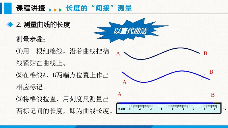测量步骤:①用一根细棉线,沿着曲线把棉线紧贴在曲线上。②在棉线A、B两端点位置上作出相应标记。③将棉线拉直,用刻度尺测量出两标记间的长度,即为曲线长度。