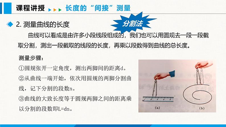 测量步骤:①圆规张开一定角度,测出两脚间的距离d。②从曲线一端开始,依次用圆规的两脚分割曲线,记下分割的段数n。③曲线的大致长度等于圆规两脚之间的距离乘以分割的段数即L=dn。