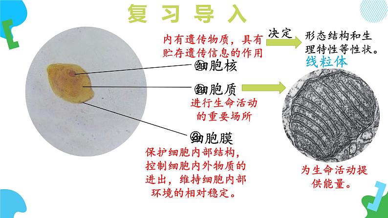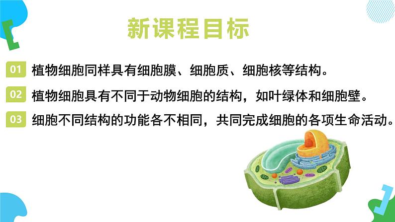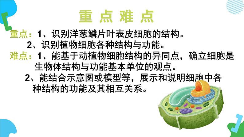重点:1、识别洋葱鳞片叶表皮细胞的结构。 2、识别植物细胞各种结构与功能。难点:1、能基于动植物细胞结构的异同点,确立细胞是 生物体结构与功能基本单位的观点。 2、能结合示意图或模型等,展示和说明细胞中各 种结构的功能及其相互关系。