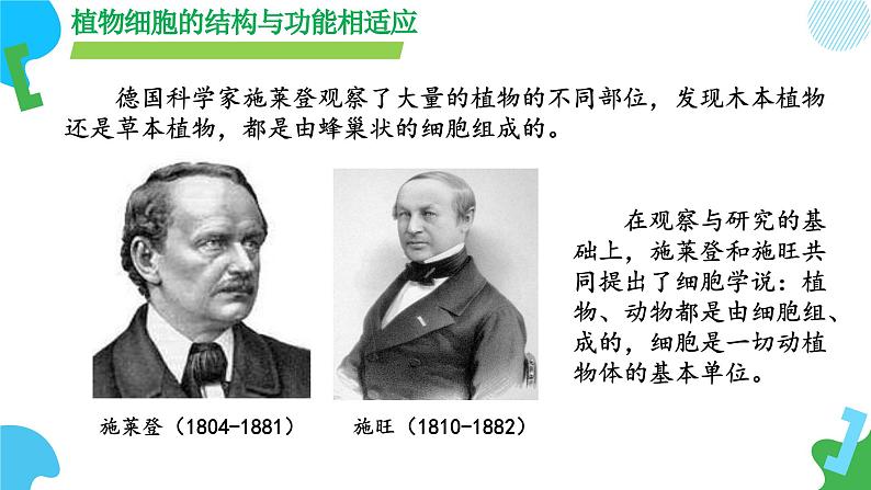 德国科学家施莱登观察了大量的植物的不同部位,发现木本植物还是草本植物,都是由蜂巢状的细胞组成的。