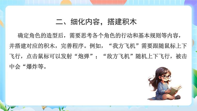 确定角色的造型后,需要思考各个角色的行动和基本规则等内容,并搭建对应的积木,完善程序。例如,“我方飞机”需要跟随鼠标上下飞行,点击鼠标可以发射“炮弹”;“敌方飞机”随机上下飞行,被击中会“爆炸等。