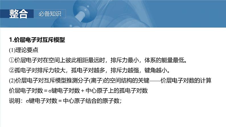1.价层电子对互斥模型(1)理论要点①价层电子对在空间上彼此相距最远时,排斥力最小,体系的能量最低。②孤电子对排斥力较大,孤电子对越多,排斥力越强,键角越小。(2)价层电子对互斥模型推测分子(离子)的空间结构的关键——价层电子对数的计算价层电子对数=σ键电子对数+中心原子上的孤电子对数说明:σ键电子对数=中心原子结合的原子数;