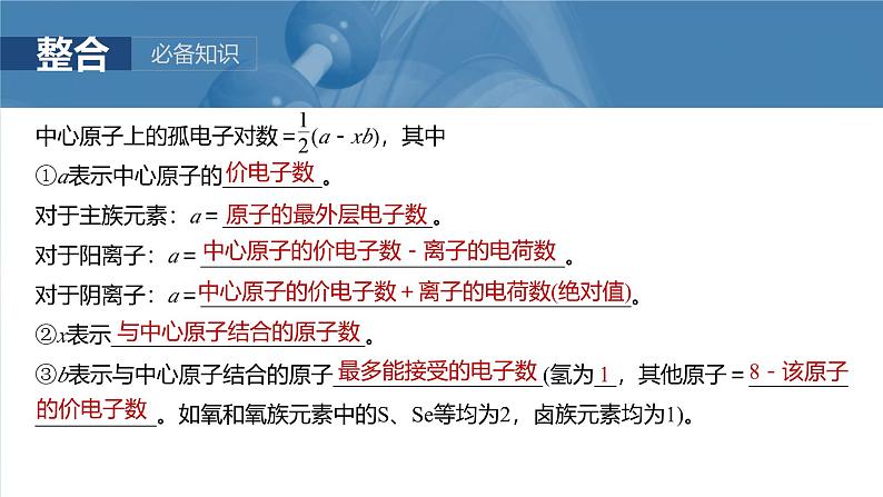 中心原子上的孤电子对数= (a-xb),其中①a表示中心原子的_________。对于主族元素:a=___________________。对于阳离子:a=_________________________________。对于阴离子:a=_______________________________________。②x表示_______________________。③b表示与中心原子结合的原子___________________(氢为__,其他原子=____________________。如氧和氧族元素中的S、Se等均为2,卤族元素均为1)。