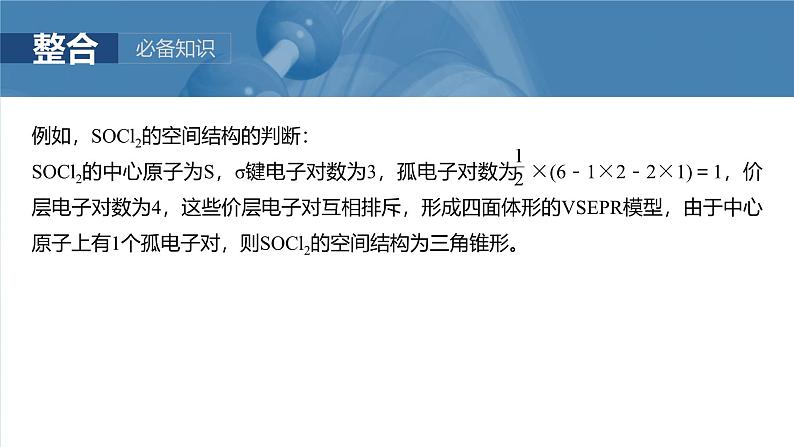 例如,SOCl2的空间结构的判断:SOCl2的中心原子为S,σ键电子对数为3,孤电子对数为 ×(6-1×2-2×1)=1,价层电子对数为4,这些价层电子对互相排斥,形成四面体形的VSEPR模型,由于中心原子上有1个孤电子对,则SOCl2的空间结构为三角锥形。