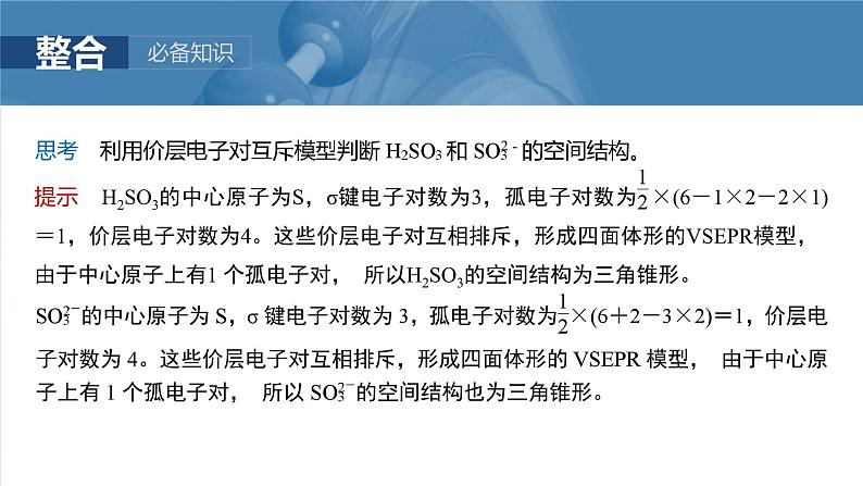 提示 H2SO3的中心原子为S,σ键电子对数为3,孤电子对数为 ×(6-1×2-2×1)=1,价层电子对数为4。这些价层电子对互相排斥,形成四面体形的VSEPR模型, 由于中心原子上有1 个孤电子对, 所以H2SO3的空间结构为三角锥形。