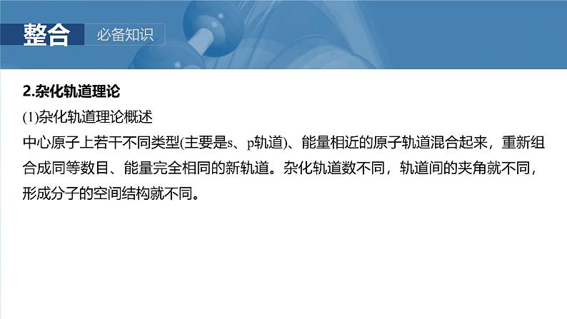 2.杂化轨道理论(1)杂化轨道理论概述中心原子上若干不同类型(主要是s、p轨道)、能量相近的原子轨道混合起来,重新组合成同等数目、能量完全相同的新轨道。杂化轨道数不同,轨道间的夹角就不同,形成分子的空间结构就不同。