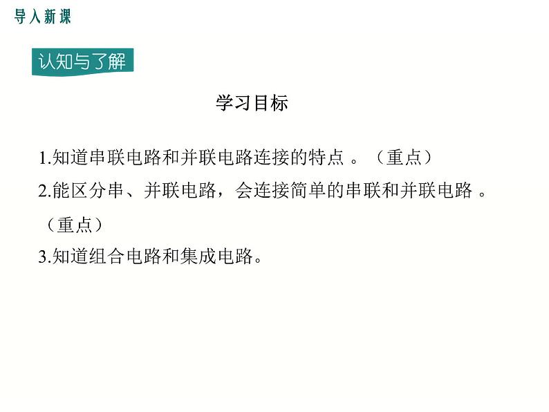 1.知道串联电路和并联电路连接的特点 。(重点)2.能区分串、并联电路,会连接简单的串联和并联电路 。(重点)3.知道组合电路和集成电路。