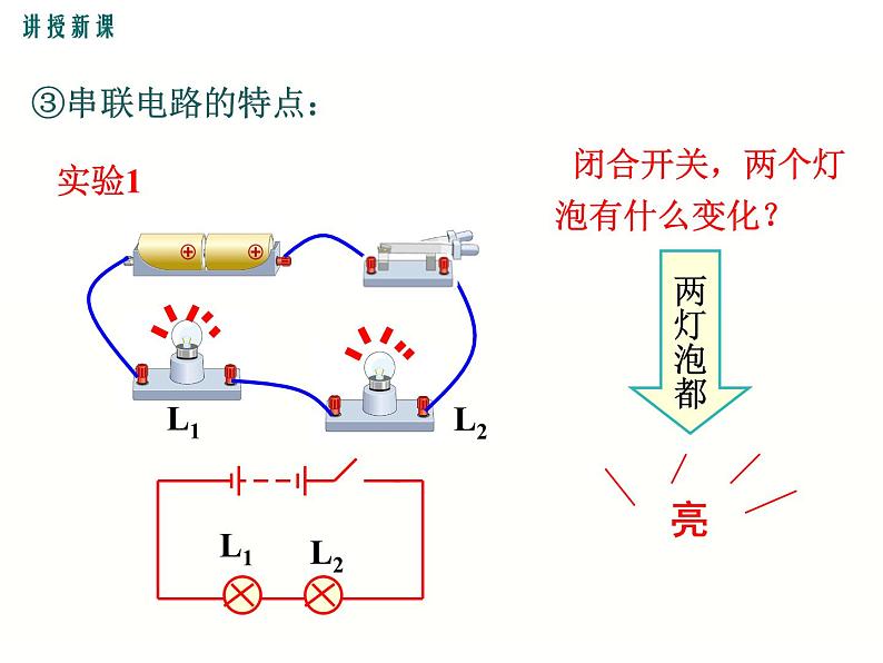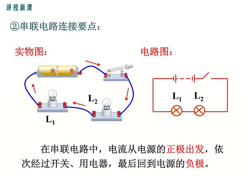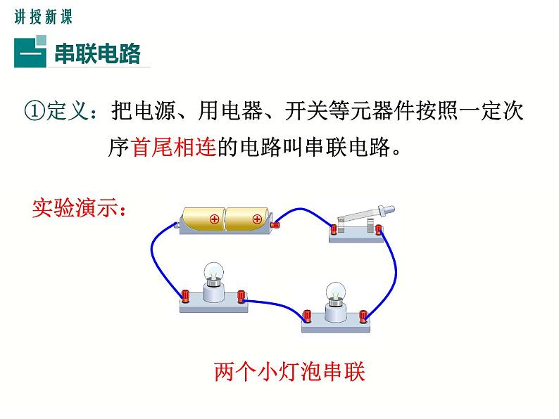 ①定义:把电源、用电器、开关等元器件按照一定次序首尾相连的电路叫串联电路。