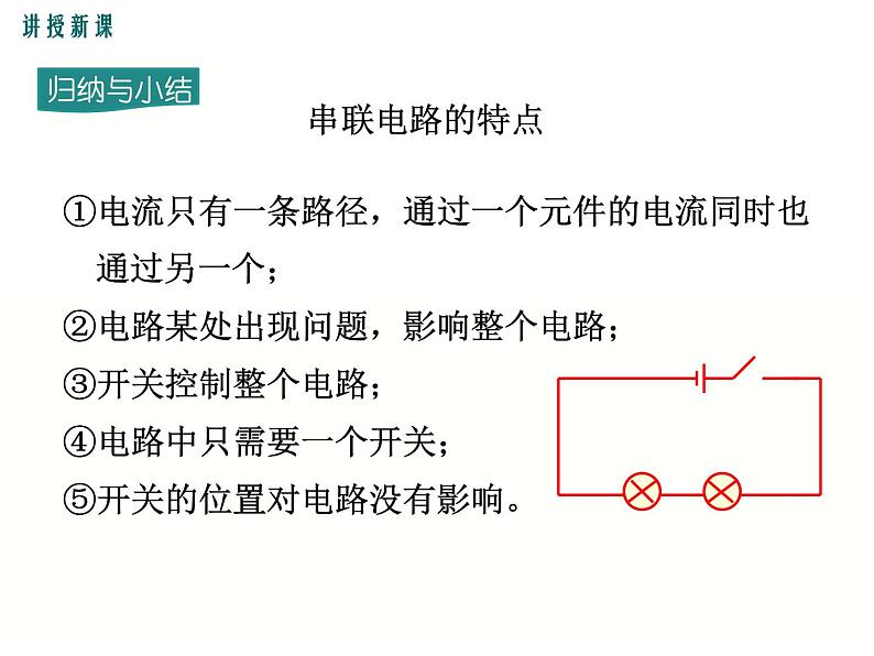 ①电流只有一条路径,通过一个元件的电流同时也通过另一个;②电路某处出现问题,影响整个电路;③开关控制整个电路;④电路中只需要一个开关;⑤开关的位置对电路没有影响。