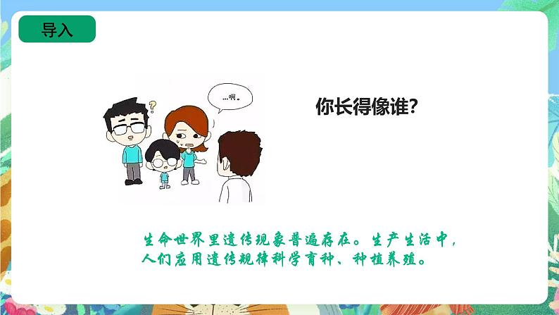 通过本节课的观察和比较人、动物、植物子代与亲代的某些特征,理解其有很多特征是相似的,包括形态结构、生理特点、行为方式等方面,从而归纳概括生物体普遍存在遗传现象,初步建立遗传的概念。
