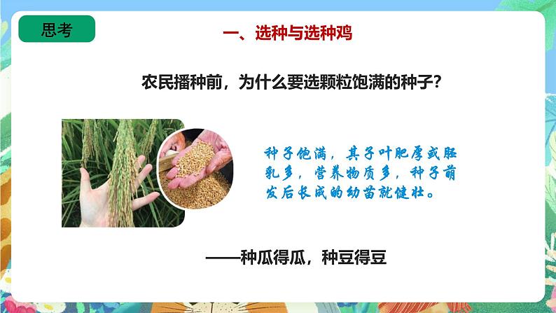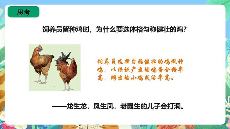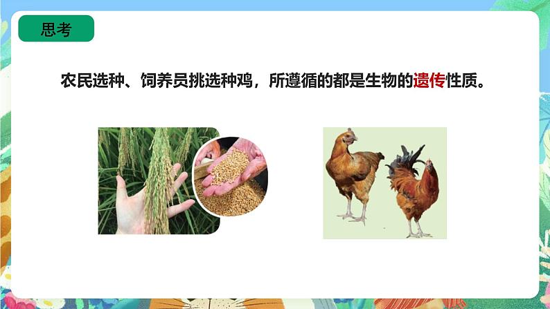 农民选种、饲养员挑选种鸡,所遵循的都是生物的遗传性质。