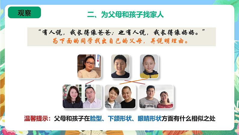 “有人说,我长得像爸爸;也有人说,我长得像妈妈。”为下面的同学找出自己的父母,并说明理由。