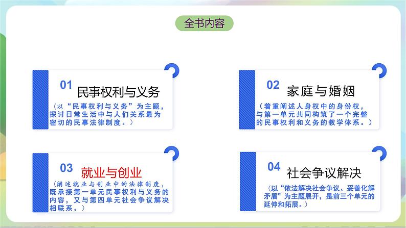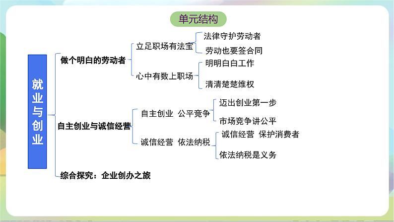 (阐述就业与创业中的法律制度,既承接第一单元民事权利与义务的内容,又与第四单元社会争议解决相联系。)