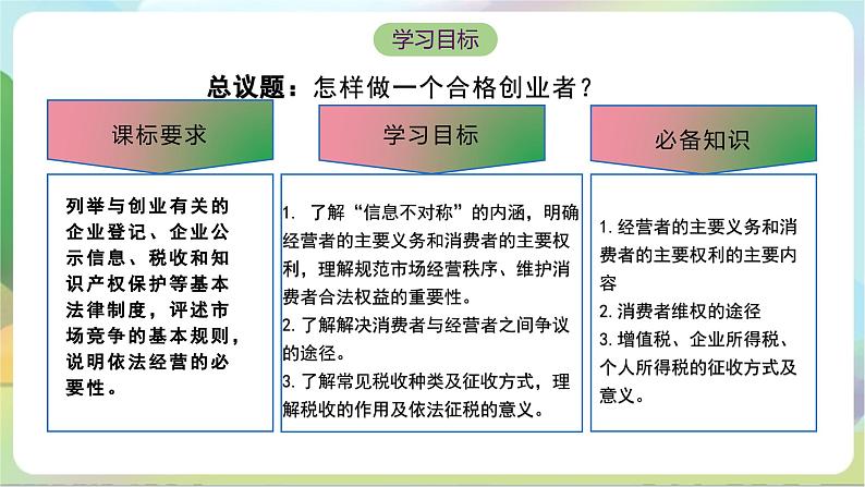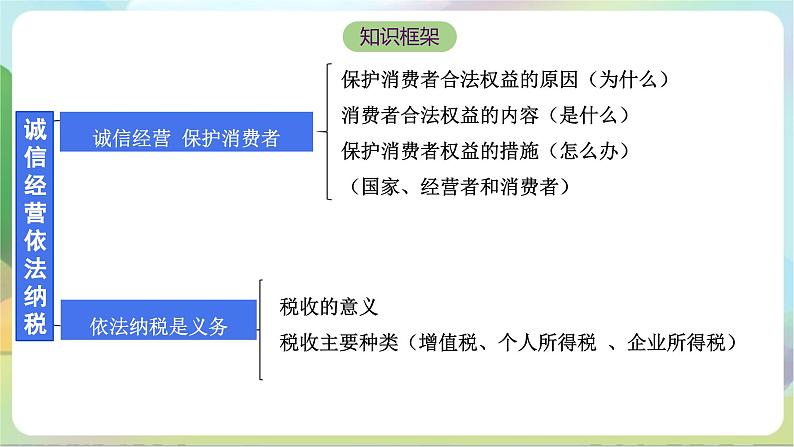 1. 了解“信息不对称”的内涵,明确经营者的主要义务和消费者的主要权利,理解规范市场经营秩序、维护消费者合法权益的重要性。2.了解解决消费者与经营者之间争议的途径。3.了解常见税收种类及征收方式,理解税收的作用及依法征税的意义。