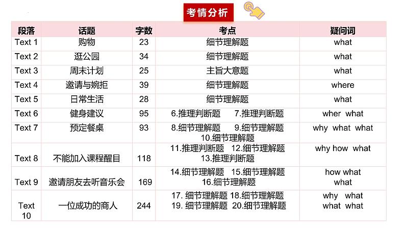 2024年新课标II卷听力部分围绕高中新课标话题及主题语境设计,加强内容和形式创新。录音材料涵盖了日常生活,如:购物、逛公园、周末计划、做课程项目、去听演唱会、讲述一位商人成功的秘诀-注重人际关系等。这些内容不仅贴近日常生活,易于带入语境、理解材料,而且有效考查学生运用英语进行日常交际以及解决实际问题的能力。考点:15个获取事实性具体信息(细节理解题)、4个对所听内容作出简单推断(推理判断题)、1个理解主旨大意题、0个理解说话者观点态度题。疑问词:问题涉及多个方面和多个角度,采用13个what-, 2个where-, 3个why-, 2个hw-等疑问词引出的问句进行提问。 口音: 美音词数:866语速:152词/分(和去年相比略有提升)结构变化:第二节的结构2-3-3-3-4(对比2024年新高考I卷为2-3-3-4-3)。
