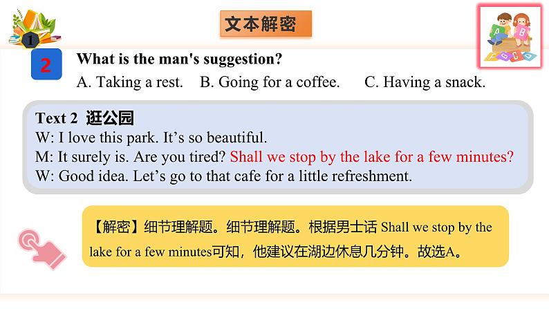 Text 2 逛公园W: I lve this park. It’s s beautiful.M: It surely is. Are yu tired? Shall we stp by the lake fr a few minutes?W: Gd idea. Let’s g t that cafe fr a little refreshment.