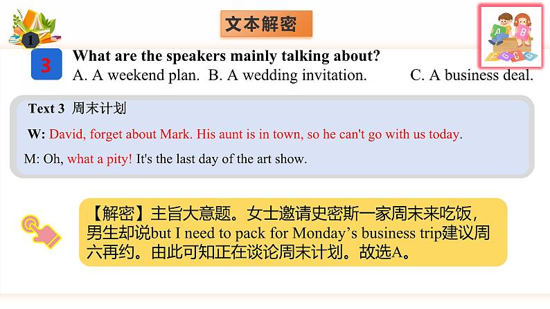 Text 3 周末计划 W: David, frget abut Mark. His aunt is in twn, s he can't g with us tday.M: Oh, what a pity! It's the last day f the art shw.