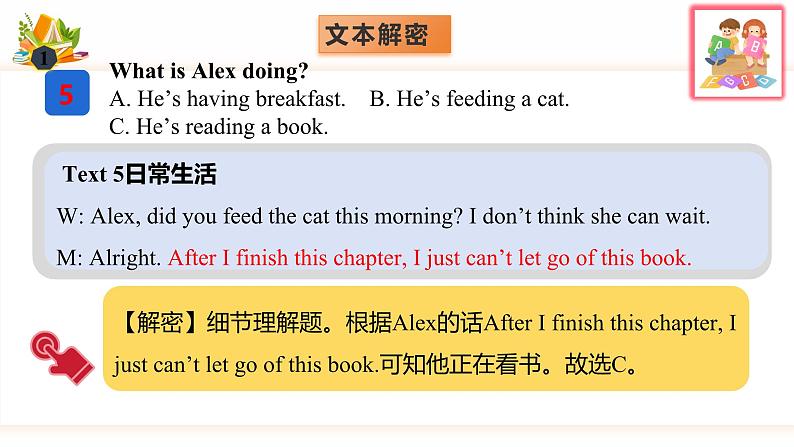 Text 5日常生活W: Alex, did yu feed the cat this mrning? I dn’t think she can wait.M: Alright. After I finish this chapter, I just can’t let g f this bk.