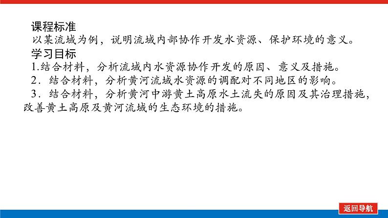展开课程标准以某流域为例,说明流域内部协作开发水资源、保护环境的意义。学习目标1.结合材料,分析流域内水资源协作开发的原因、意义及措施。2.结合材料,分析黄河流域水资源的调配对不同地区的影响。3.结合材料,分析黄河中游黄土高原水土流失的原因及其治理措施,改善黄土高原及黄河流域的生态环境的措施。