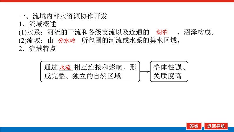 一、流域内部水资源协作开发1.流域概述(1)水系:河流的干流和各级支流以及连通的________、沼泽构成。(2)流域:由________所包围的河流或水系的集水区域。2.流域特点
