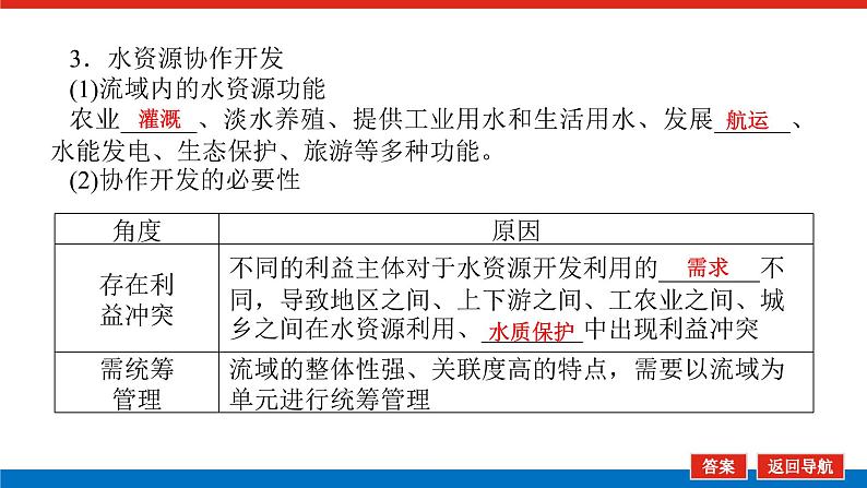3.水资源协作开发(1)流域内的水资源功能农业______、淡水养殖、提供工业用水和生活用水、发展______、水能发电、生态保护、旅游等多种功能。(2)协作开发的必要性
