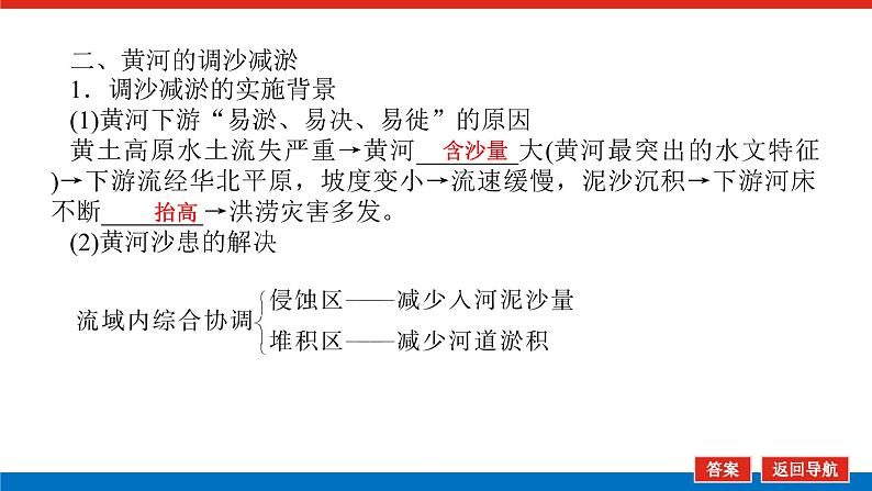 二、黄河的调沙减淤1.调沙减淤的实施背景(1)黄河下游“易淤、易决、易徙”的原因黄土高原水土流失严重→黄河________大(黄河最突出的水文特征)→下游流经华北平原,坡度变小→流速缓慢,泥沙沉积→下游河床不断________→洪涝灾害多发。(2)黄河沙患的解决