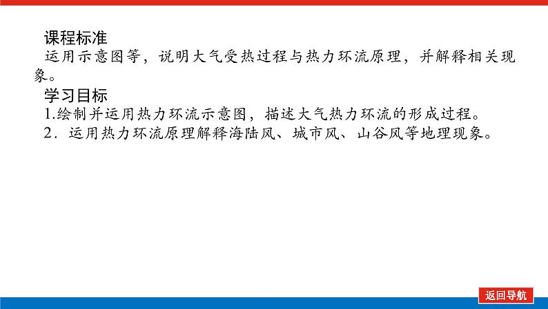 展开课程标准运用示意图等,说明大气受热过程与热力环流原理,并解释相关现象。学习目标1.绘制并运用热力环流示意图,描述大气热力环流的形成过程。2.运用热力环流原理解释海陆风、城市风、山谷风等地理现象。