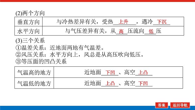 (2)两个方向(3)三个关系①温差关系:近地面两地有气温差。②风压关系:水平方向上,风总是从高压吹向低压。③等压面的凹凸关系