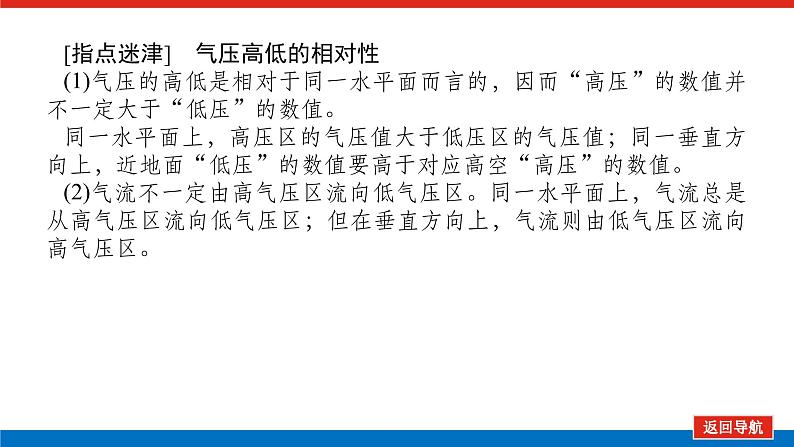 [指点迷津] 气压高低的相对性(1)气压的高低是相对于同一水平面而言的,因而“高压”的数值并不一定大于“低压”的数值。同一水平面上,高压区的气压值大于低压区的气压值;同一垂直方向上,近地面“低压”的数值要高于对应高空“高压”的数值。(2)气流不一定由高气压区流向低气压区。同一水平面上,气流总是从高气压区流向低气压区;但在垂直方向上,气流则由低气压区流向高气压区。