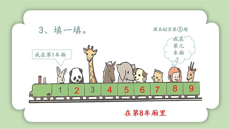 人教版·一年级上册 6~10的认识和加、减法1.4 练习一 授课时间:XX-XX-XX授课老师:DALI课本42页第①题1.按0~9的顺序连线。2、画一画,数一数,写一写。课本42页第②题8989<3、填一填。课本42页第③题我在第1车厢我在第几车厢?2456789在第8车厢里4、找一找。课本33页第4题5、画一画,比一比。课本43页第⑤题><><6、圈出能组成8的两位数。课本43页第⑥题6、圈出能组成9的两位数。课本43页第⑥题7、圈出能组成9的两位数。课本43页第⑦题63658、圈出能组成9的两位数。课本43页第⑧题62549