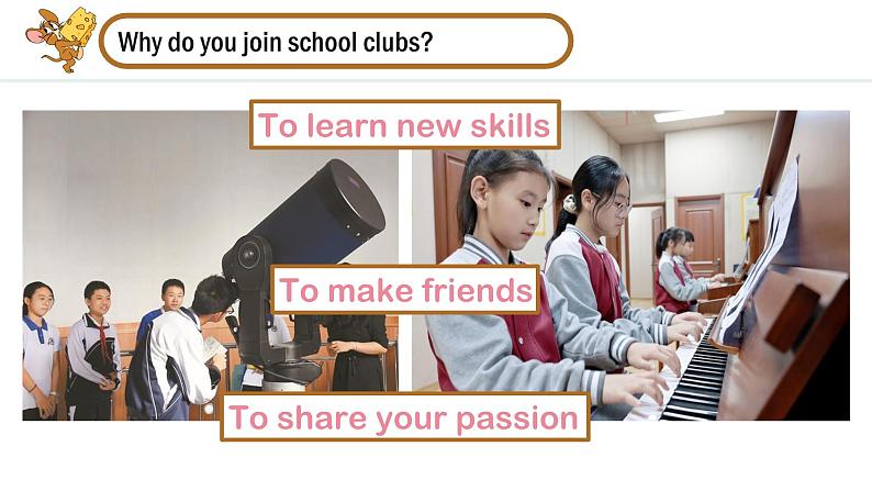 Teng Fei: Hi there! Wha(t) clu(b) d yu wan(t) t jin?Peter: I have n idea.Teng Fei: Here’s sme gd news! Our schl wants t start a musi(c) club. D yu wan(t) t jin?Peter: Sure. I can play the guitar. What abut yu, Emma?Emma: I’d l(ve) t, but I can’(t) play any musical instruments.