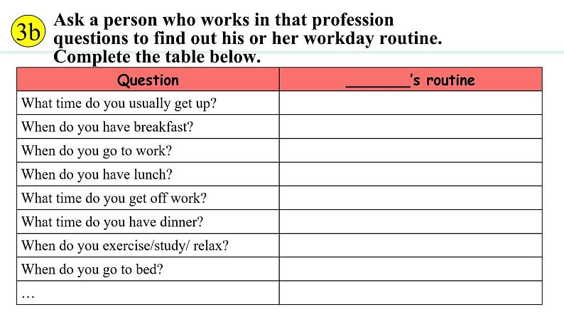 Ask a persn wh wrks in that prfessin questins t find ut his r her wrkday rutine. Cmplete the table belw.
