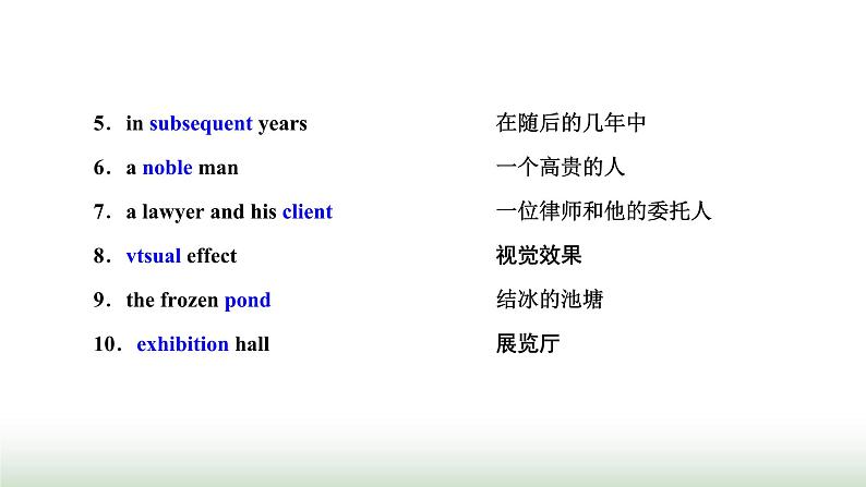 5.in subsequent years 在随后的几年中6.a nble man 一个高贵的人7.a lawyer and his client一位律师和他的委托人8.vtsual effect 视觉效果9.the frzen pnd 结冰的池塘10.exhibitin hall 展览厅