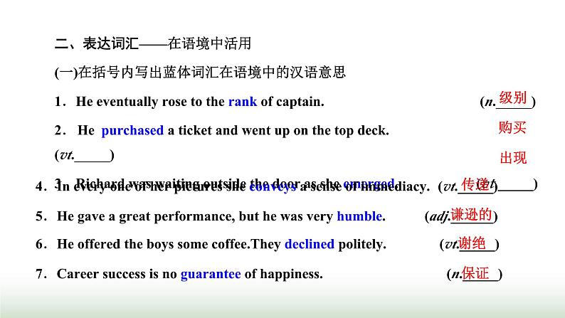 二、表达词汇——在语境中活用(一)在括号内写出蓝体词汇在语境中的汉语意思1.He eventually rse t the rank f captain. (n._____)2.He purchased a ticket and went up n the tp deck. (vt._____)3.Richard was waiting utside the dr as she emerged. (vt._____)