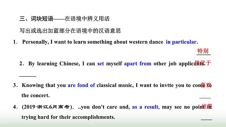 三、词块短语——在语境中辨义用活写出或选出加蓝部分在语境中的汉语意思1.Persnally, I want t learn smething abut western dance in particular. _____2.By learning Chinese, I can set myself apart frm ther jb applicants. ______3.Knwing that yu are fnd f classical music, I want t invtte yu t cme t the cncert. ____4.(2019·浙江6月高考). dn't care and, as a result, may see n pint in trying hard fr their accmplishments. ____