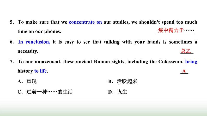5.T make sure that we cncentrate n ur studies, we shuldn't spend t much time n ur phnes. _______________6.In cnclusin, it is easy t see that talking with yur hands is smetimes a necessity. _____7.T ur amazement, these ancient Rman sights, including the Clsseum, bring histry t life.___A.重现 B.活跃起来C.过着一种……的生活 D.谋生