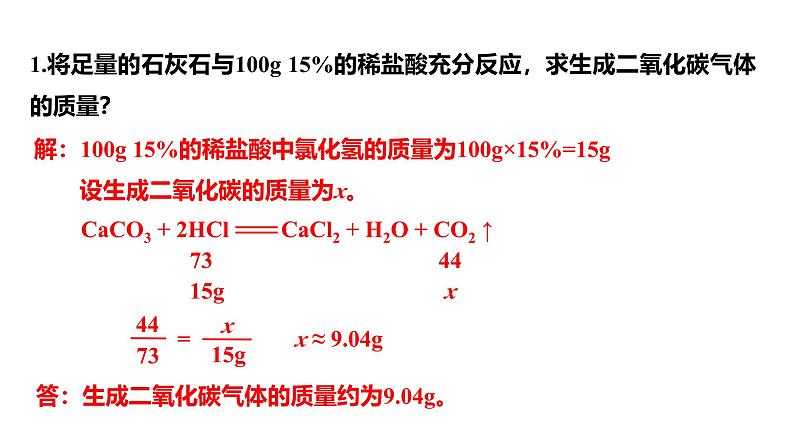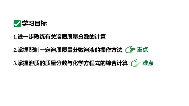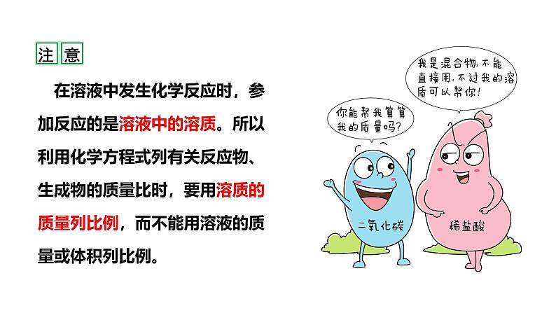 课时2 溶质质量分数的综合计算学习目标新课引入新知学习课堂小结1.进一步熟练有关溶质质量分数的计算2.掌握配制一定溶质质量分数溶液的操作方法3.掌握溶质的质量分数与化学方程式的综合计算1.溶质的质量分数:2.溶质的质量和溶剂的质量的计算:溶质的质量 = 溶液的质量 × 溶质的质量分数溶剂的质量 = 溶液的质量 + 溶质的质量1.将足量的石灰石与100g 15%的稀盐酸充分反应,求生成二氧化碳气体的质量?求出二氧化碳的质量求出稀盐酸中溶质的质量1.将足量的石灰石与100g 15%的稀盐酸充分反应,求生成二氧化碳气体的质量?答:生成二氧化碳气体的质量约为9.04g。设生成二氧化碳的质量为x。 73 44 15g xx ≈ 9.04g解:100g 15%的稀盐酸中氯化氢的质量为100g×15%=15g 在溶液中发生化学反应时,参加反应的是溶液中的溶质。所以利用化学方程式列有关反应物、生成物的质量比时,要用溶质的质量列比例,而不能用溶液的质量或体积列比例。2.将5.8g某生铁样品放入94.6g稀盐酸中,恰好完全反应(生铁样品中的杂质不溶于水也不与稀盐酸反应)产生0.2g氢气。计算反应后所得溶液中溶质的质量分数。求铁的质量求出氯化亚铁的质量计算反应后氯化亚铁溶液的质量2.将5.8g某生铁样品放入94.6g稀盐酸中,恰好完全反应(生铁样品中的杂质不溶于水也不与稀盐酸反应)产生0.2g氢气。计算反应后所得溶液中溶质的质量分数。解:设5.8g生铁样品中铁的质量为x,反应生成氯化亚铁的质量为y。Fe + 2HCl FeCl2 + H2↑56 127 2 x y 0.2g反应后所得氯化亚铁溶液的质量为: 5.6g + 94.6g - 0.2g = 100g 反应后所得氯化亚铁溶液中溶质的质量分数为:答:反应后所得氯化亚铁溶液中溶质的质量分数为12.7%。1. 溶液组成法:溶液质量 = 溶质质量 + 溶剂质量。有些反应不生成(或不消耗)水,溶剂(水)的质量等于参加反应的各溶液中溶剂质量之和;若反应后有水生成(或反应中消耗了水),则还需要加上(或减去)生成(或消耗)水的质量。求反应后所得溶液的质量的两种方法2. 质量守恒法:反应后所得溶液的质量 = 反应物的质量总和 - 生成气体的质量 - 生成沉淀的质量。3.为测定某工厂排放的废水中氢氧化钠的含量,兴趣小组将100g该废水与50g硫酸铜溶液混合恰好完全反应,得到4.9g沉淀。请计算该废水中氢氧化钠的质量分数。【提示:CuSO4+2NaOH ===== Na2SO4+Cu(OH)2↓】求出氢氧化钠的质量计算废水中氢氧化钠质量分数 80 98 x 4.9 g答:废水中氢氧化钠的质量分数为4%。解:设参加反应氢氧化钠的质量为x。CuSO4+2NaOH ===== Na2SO4+Cu(OH)2↓3.为测定某工厂排放的废水中氢氧化钠的含量,兴趣小组将100g该废水与50g硫酸铜溶液混合恰好完全反应,得到4.9g沉淀。请计算该废水中氢氧化钠的质量分数。【提示:CuSO4+2NaOH ===== Na2SO4+Cu(OH)2↓】4.实验室用34g过氧化氢溶液和1g二氧化锰制取氧气,实验的相关数据如图。请回答:(1)反应生成氧气的质量为______g。(2)计算过氧化氢溶液中溶质的质量分数。1.6求生成氧气的质量求过氧化氢的质量求溶质的质量分数(2)计算过氧化氢溶液中溶质的质量分数。解:设34g过氧化氢溶液中过氧化氢的质量为x。2H2O2 ===== 2H2O+O2↑答:过氧化氢溶液中溶质的质量分数为10%。68 32 x 1.6g 某实验小组的同学为了测定石灰石样品中碳酸钙的质量分数,取12.5g该样品放入烧杯中,加入94.4g一定质量分数的稀盐酸。恰好完全反应后烧杯中物质的质量为102.5g(不含烧杯质量)。(说明:杂质既不溶于水也不参与反应)求:(1)生成气体的质量。 (2)反应后所得溶液中溶质的质量分数。CaCO3 + 2HCl ===== CaCl2 + H2O + CO2 ↑(2)解:设碳酸钙的质量为x,生成的氯化钙质量为y。100 111 44 x y 4.4g(1)生成二氧化碳的质量为12.5g + 94.4g - 102.5g = 4.4g。反应后所得溶液的质量为102.5g- (12.5g - 10g) = 100g溶液中溶质的质量分数为 ×100%=11.1%答:反应后所得溶液中溶质的质量分数为11.1% 。 生活中有各种各样的溶液,很多溶液的溶质质量分数是一定的,如输液用的生理盐水。那么如何配制一定溶质质量分数的溶液呢?【仪器】氯化钠、蒸馏水。【药品】1. 计算: NaCl g H2O g。2. 称量:用__________称量3g食盐,放入烧杯中。3. 量取:用_____量取47mL水(水的密度可近似看做1g/cm3),倒入盛有氯化钠的烧杯中。347托盘天平量筒4.溶解:用玻璃棒搅拌,使氯化钠溶解。整个配制过程如下图所示。用已配好的质量分数为6%的氯化钠溶液(密度约为1.04g/cm3),配制50g质量分数为3%的氯化钠溶液。1.计算:配制50g质量分数为3%的氯化钠溶液所需质量分数为6%的氯化钠溶液和水的质量分别为:6%的氯化钠溶液 g(体积 mL);水 g。2525242.量取:用量筒量取24mL的6%氯化钠溶液和25mL的水,倒入烧杯中。3.混匀:用玻璃棒搅拌,使溶液混合均匀。 最后,把配制好的上述两种氯化钠溶液分别装入试剂瓶中,盖好瓶塞并贴上标签(标签中应包括药品名称和溶液中溶质的质量分数),放到试剂柜中。一定溶质质量分数的氯化钠溶液的配制用天平称量药品时,应遵循“左物右码”的原则。如果实验中药品和砝码放反了,最终配制溶液的溶质质量分数会偏大还是偏小?配制一定溶质质量分数溶液的误差分析溶质质量增大或溶剂质量减小溶质质量减小或溶剂质量增大溶质质量分数偏大溶质质量分数偏小偏小偏小偏小偏小偏小偏小不变不变不变不变不变不变不变不变偏大偏大偏大偏大偏大偏小不变偏大同比例减小不变不变不变偏小偏大偏小偏大偏大不变偏小不变
