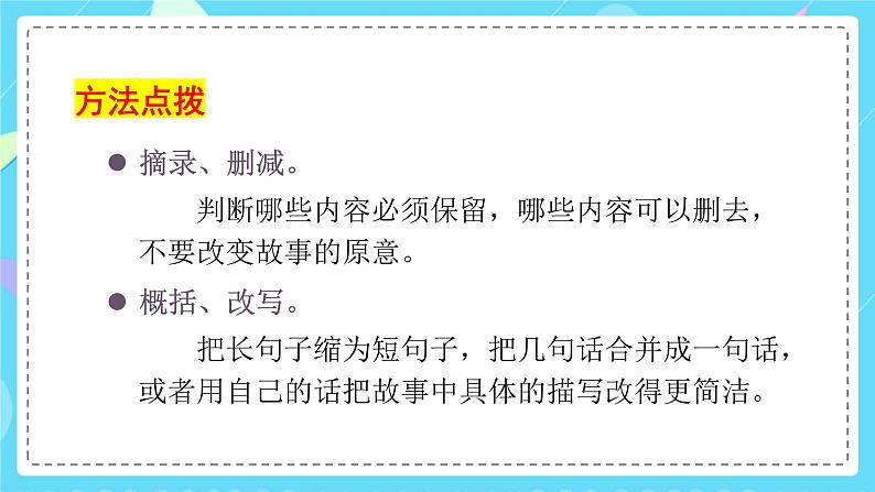 把长句子缩为短句子,把几句话合并成一句话,或者用自己的话把故事中具体的描写改得更简洁。