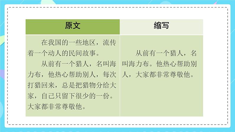 缩写《猎人海力布》的其他段落,把课文缩写成一个简短的故事。注意缩写完成后,与原文对比一下,看看故事是否完整,情节是否连贯,语句是否通顺。