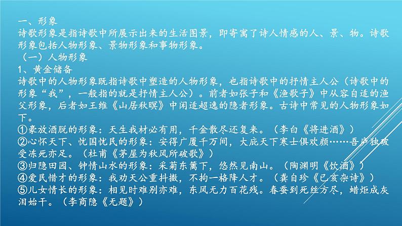 展开一、形象诗歌形象是指诗歌中所展示出来的生活图景,即寄寓了诗人情感的人、景、物。诗歌形象包括人物形象、景物形象和事物形象。(一)人物形象1、黄金储备诗歌中的人物形象既指诗歌中塑造的人物形象,也指诗歌中的抒情主人公(诗歌中的形象“我”,一般指的就是抒情主人公)。前者如张子和《渔歌子》中从容自适的渔父形象,后者如王维《山居秋暝》中闲适超逸的隐者形象。古诗中常见的人物形象如下。①豪放酒脱的形象:天生我材必有用,千金散尽还复来。(李白《将进酒》)②心怀天下、忧国忧民的形象:安得广厦千万间,大庇天下寒士俱欢颜……吾庐独破受冻死亦足。(杜甫《茅屋为秋风所破歌》)③归隐田园、钟情山水的形象:采菊东篱下,悠然见南山。(陶渊明《饮酒》)④爱民惜才的形象:我劝天公重抖擞,不拘一格降人才。(龚自珍《已亥杂诗》)⑤儿女情长的形象:相见时难别亦难,东风无力百花残。春蚕到死丝方尽,蜡炬成灰泪始干。(李商隐《无题》)