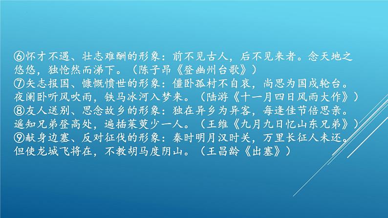 ⑥怀才不遇、壮志难酬的形象:前不见古人,后不见来者。念天地之悠悠,独怆然而涕下。(陈子昂《登幽州台歌》)⑦矢志报国、慷慨愤世的形象:僵卧孤村不自哀,尚思为国戍轮台。夜阑卧听风吹雨,铁马冰河入梦来。(陆游《十一月四日风雨大作》)⑧友人送别、思念故乡的形象:独在异乡为异客,每逢佳节倍思亲。遥知兄弟登高处,遍插茱萸少一人。(王维《九月九日忆山东兄弟》)⑨献身边塞、反对征伐的形象:秦时明月汉时关,万里长征人未还。但使龙城飞将在,不教胡马度阴山。(王昌龄《出塞》)