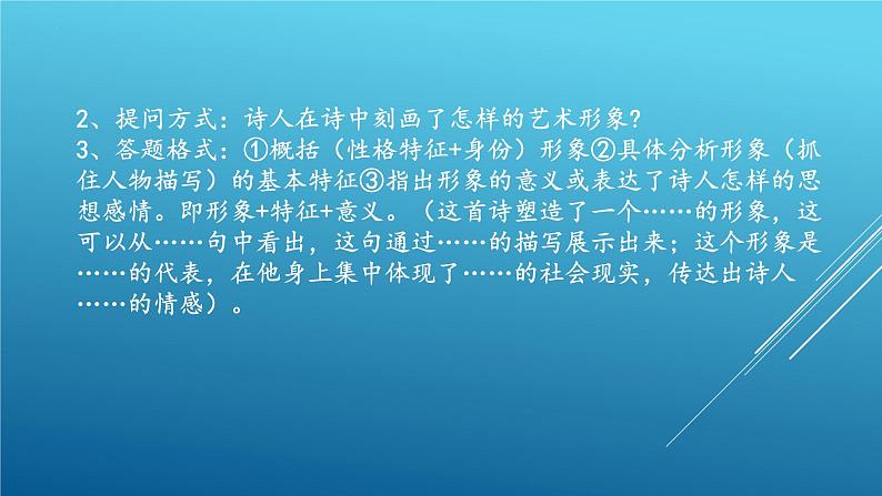 2、提问方式:诗人在诗中刻画了怎样的艺术形象?3、答题格式:①概括(性格特征+身份)形象②具体分析形象(抓住人物描写)的基本特征③指出形象的意义或表达了诗人怎样的思想感情。即形象+特征+意义。(这首诗塑造了一个……的形象,这可以从……句中看出,这句通过……的描写展示出来;这个形象是……的代表,在他身上集中体现了……的社会现实,传达出诗人……的情感)。