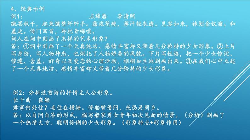 4、经典示例例1: 点绛唇 李清照蹴罢秋千,起来慵整纤纤手。露浓花瘦,薄汗轻衣透。见客如来,袜刬金钗溜。和羞走。倚门回首,却把青梅嗅。词人在词中刻画了怎样的艺术形象?答:①词中刻画了一个天真纯洁、感情丰富却又带着几分矜持的少女形象。②上片写身份,写人物神态,也烘托了人物娇美的风貌。下片写性格,把一个少女惊诧、惶遽、含羞、好奇以及爱恋的心理活动,栩栩如生地刻画出来。③在我们心中立起了一个天真纯洁、感情丰富却又带着几分矜持的少女形象。