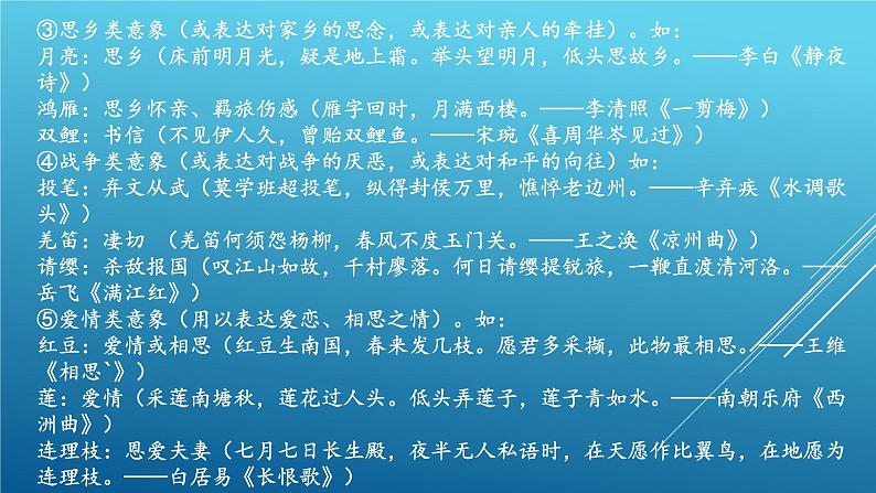 ③思乡类意象(或表达对家乡的思念,或表达对亲人的牵挂)。如:月亮:思乡(床前明月光,疑是地上霜。举头望明月,低头思故乡。——李白《静夜诗》)鸿雁:思乡怀亲、羁旅伤感(雁字回时,月满西楼。——李清照《一剪梅》)双鲤:书信(不见伊人久,曾贻双鲤鱼。——宋琬《喜周华岑见过》)④战争类意象(或表达对战争的厌恶,或表达对和平的向往)如:投笔:弃文从武(莫学班超投笔,纵得封侯万里,憔悴老边州。——辛弃疾《水调歌头》)羌笛:凄切 (羌笛何须怨杨柳,春风不度玉门关。——王之涣《凉州曲》)请缨:杀敌报国(叹江山如故,千村廖落。何日请缨提锐旅,一鞭直渡清河洛。——岳飞《满江红》)⑤爱情类意象(用以表达爱恋、相思之情)。如:红豆:爱情或相思(红豆生南国,春来发几枝。愿君多采撷,此物最相思。——王维《相思`》)莲:爱情(采莲南塘秋,莲花过人头。低头弄莲子,莲子青如水。——南朝乐府《西洲曲》)连理枝:恩爱夫妻(七月七日长生殿,夜半无人私语时,在天愿作比翼鸟,在地愿为连理枝。——白居易《长恨歌》)