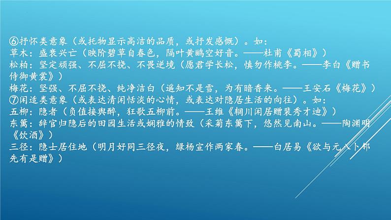 ⑥抒怀类意象(或托物显示高洁的品质,或抒发感慨)。如:草木:盛衰兴亡(映阶碧草自春色,隔叶黄鹂空好音。——杜甫《蜀相》)松柏:坚定顽强、不屈不挠、不畏逆境(愿君学长松,慎勿作桃李。——李白《赠书侍御黄裳》)梅花:坚强、不屈不挠、纯净洁白(遥知不是雪,为有暗香来。——王安石《梅花》)⑦闲适类意象(或表达清闲恬淡的心情,或表达对隐居生活的向往)。如:五柳:隐者(负值接舆醉,狂歌五柳前。——王维《辋川闲居赠裴秀才迪》)东篱:辞官归隐后的田园生活或娴雅的情致(采菊东篱下,悠然见南山。——陶渊明《饮酒》)三径:隐士居住地(明月好同三径夜,绿杨宣作两家春。——白居易《欲与元八卜邻先有是赠》)