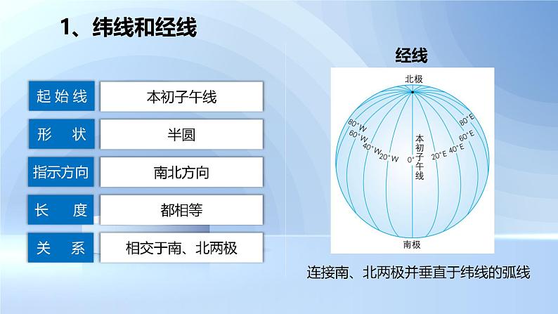 (1)两条正相对的经线组成一个经线圈(经度和为180°,东西经相反)(2)长度为4万千米(大圆)(3)平分地球。(4)20°W--160°E把地球划分为东西两半球