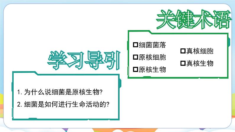 这是一份生物七年级上册(2024)第二单元 多彩的生命世界第三章 微生物可以分为病毒、细菌和真菌第二节 细菌是原核生物精品ppt课件,共42页。PPT课件主要包含了学习导引,关键术语,细菌没有成形的细胞核,阅读聚焦等内容,欢迎下载使用。