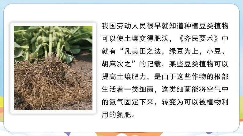 我国劳动人民很早就知道种植豆类植物可以使土壤变得肥沃,《齐民要术》中就有“凡美田之法,绿豆为上,小豆、胡麻次之”的记载。某些豆类植物可以提高土壤肥力,是由于这些作物的根部生活着一类细菌,这类细菌能将空气中的氮气固定下来,转变为可以被植物利用的氮肥。