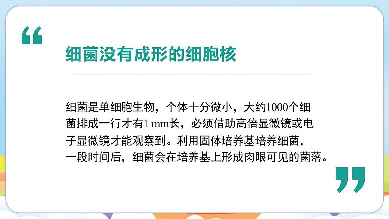 细菌是单细胞生物,个体十分微小,大约1000个细菌排成一行才有1 mm长,必须借助高倍显微镜或电子显微镜才能观察到。利用固体培养基培养细菌,一段时间后,细菌会在培养基上形成肉眼可见的菌落。