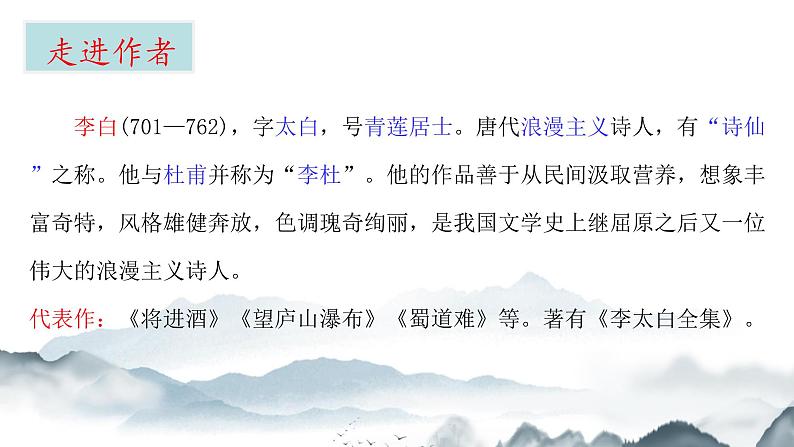 李白(701—762),字太白,号青莲居士。唐代浪漫主义诗人,有“诗仙”之称。他与杜甫并称为“李杜”。他的作品善于从民间汲取营养,想象丰富奇特,风格雄健奔放,色调瑰奇绚丽,是我国文学史上继屈原之后又一位伟大的浪漫主义诗人。代表作:《将进酒》《望庐山瀑布》《蜀道难》等。著有《李太白全集》。